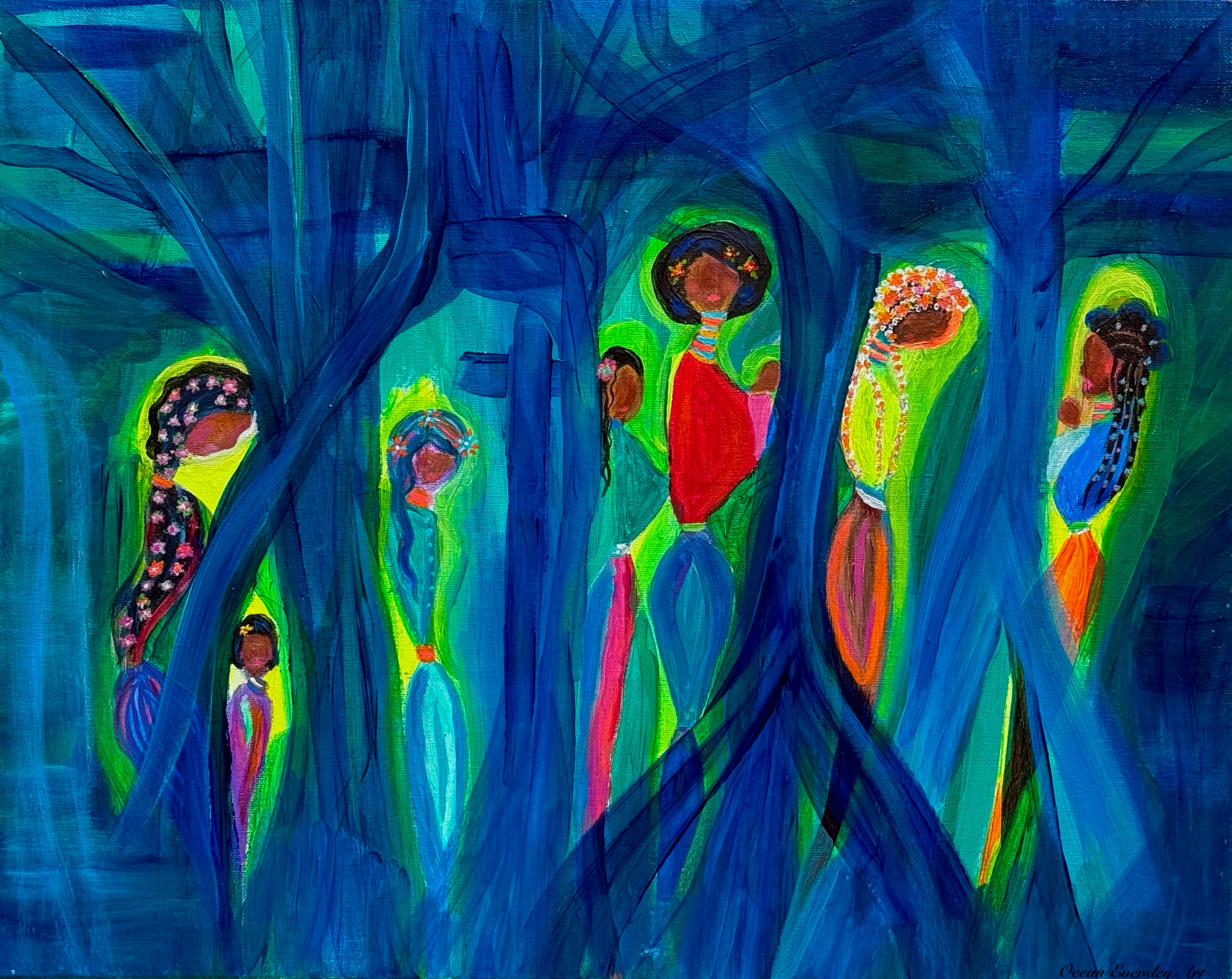 The indigo woods themselves are not bound to a single time or place. They exist somewhere between dream and history, shaped by memory and imagination. The trees—stand tall like sentinels or songlines, their trunks not only reaching upward but rooting in all directions, as if charting the many paths now open, the freedom to move, to choose, to become, This piece doesn’t aim for historical exactitude in setting but rather emotional truth. I wanted the viewer to feel what I felt as I painted: a quiet awe, a swelling pride, a bone-deep knowing that freedom—though delayed—was worthy of joy and ceremony. That joy, especially as held by Black women, is revolutionary. This is our sacred gathering. Our light in the dark. Our becoming.
