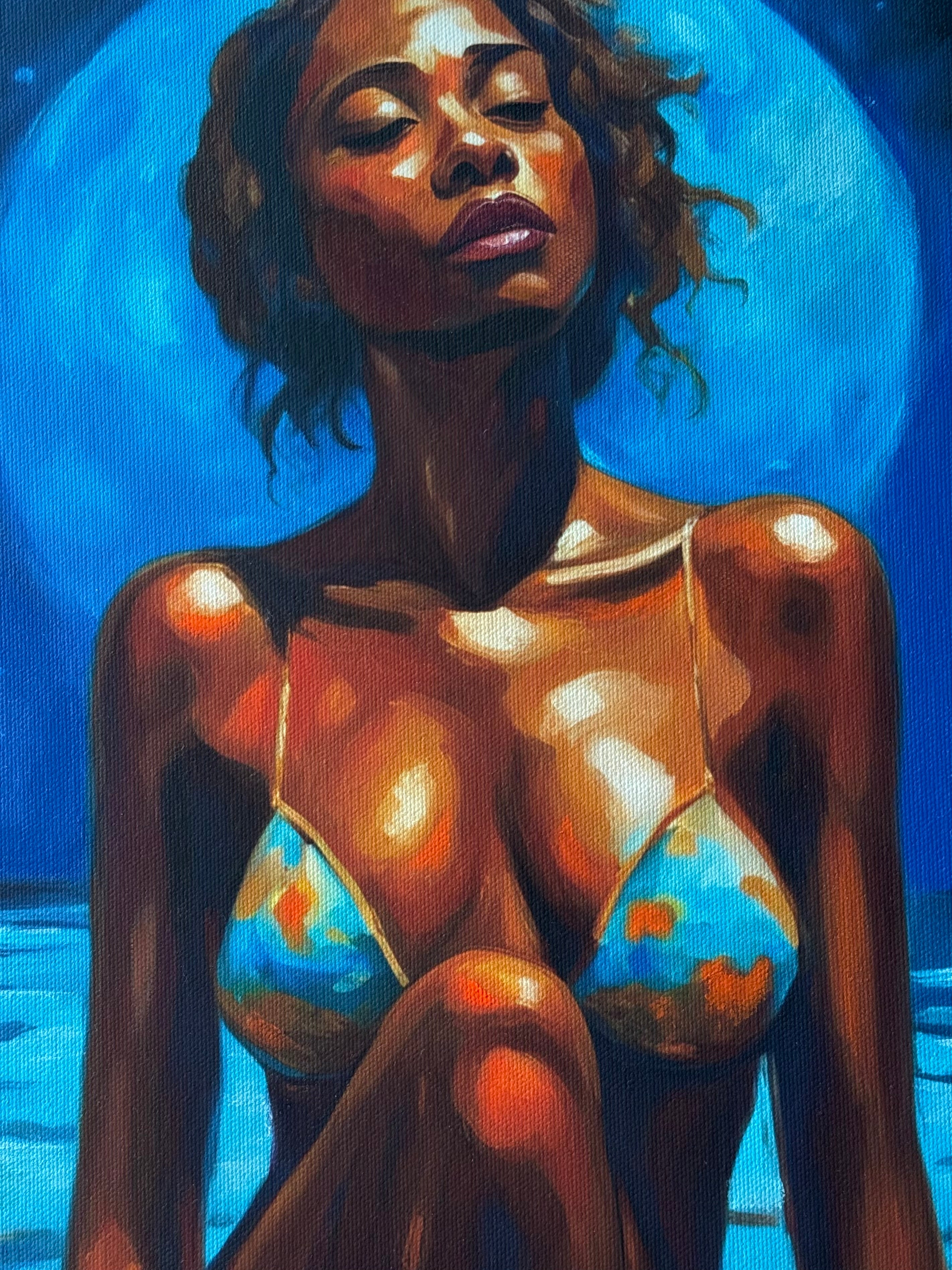 Moonlit Meditation is a visual hymn to feminine power and cosmic connection. Beneath the rare glow of a blue moon, a woman emerges from tranquil waters, her skin kissed by light and mystery. She is neither posing nor waiting—she is becoming. With eyes closed and breath aligned with the tides, she exudes a sacred stillness that blurs the line between spirit and body, between Earth and sky. Her bikini, patterned like the planet itself, evokes the continents and oceans, as if she carries the world not just on her skin, but in her soul.