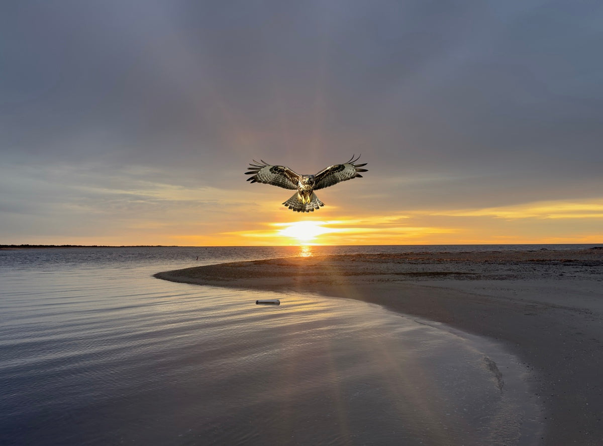 Standing on the beach, I watched a brown owl fly toward me as the golden sun pressed through gray clouds along the horizon. The light gathered behind its wings, turning the air warm and luminous, the sea below catching small flashes of gold. The owl moved steadily forward, centered in the glow, as sky and water held its passage in quiet balance. I titled this photograph Carried by the Light for the way the moment unfolded—wing, sun, and shore joined in a single, radiant motion.